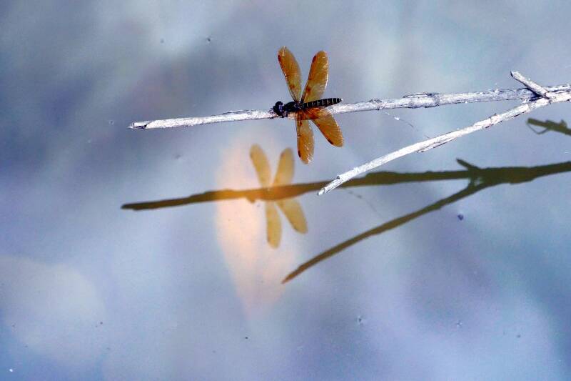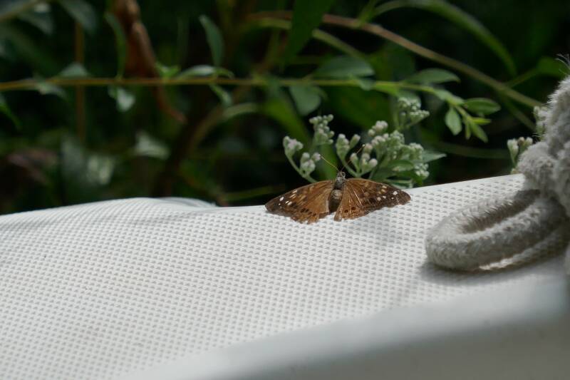 One day I stopped at a Butterfly Garden on my way home. At first, I thought the only butterflies were the metal ones used as decoration amongst the few blooming flowers. But eventually, with close scrutiny, I found a couple of live ones.